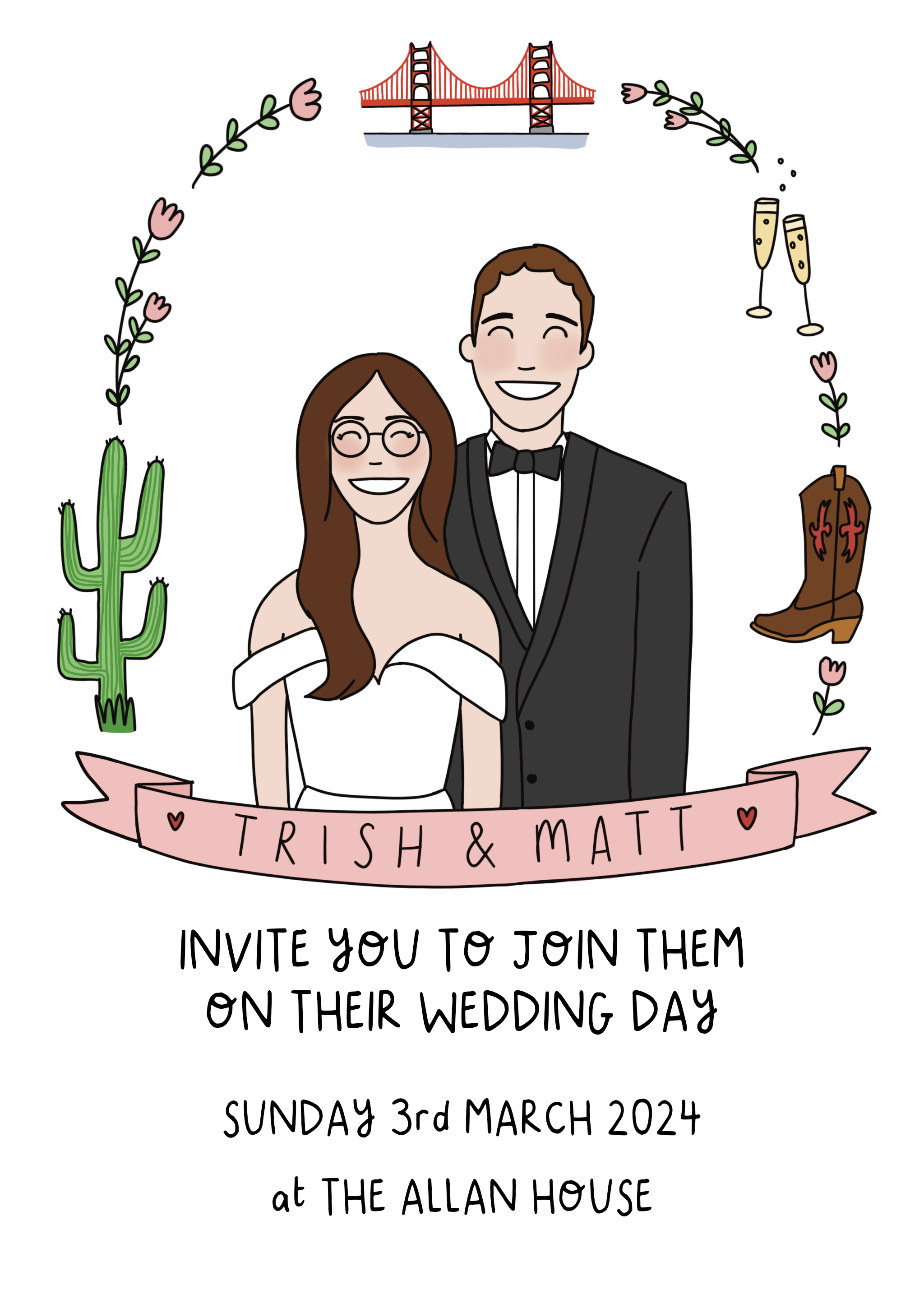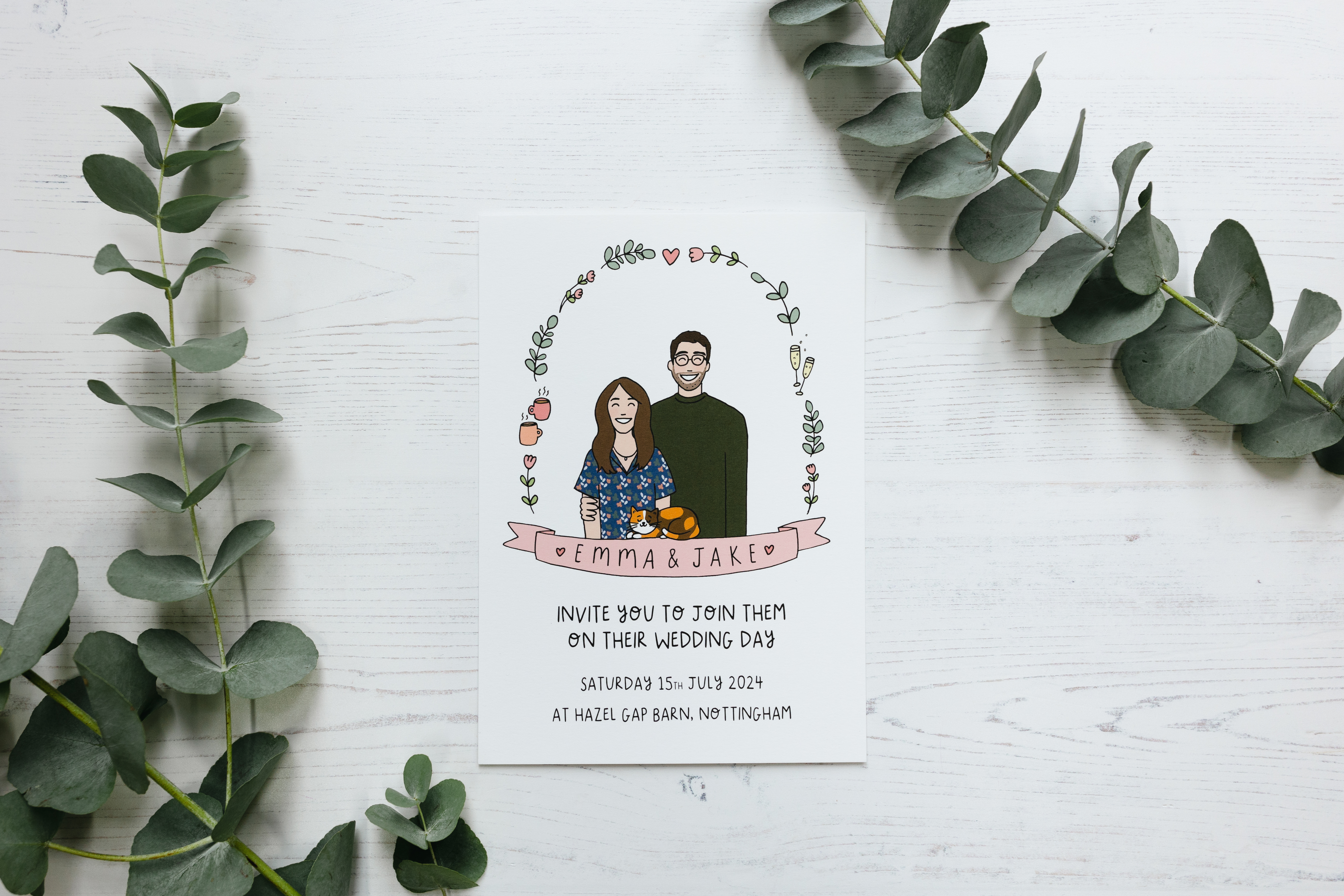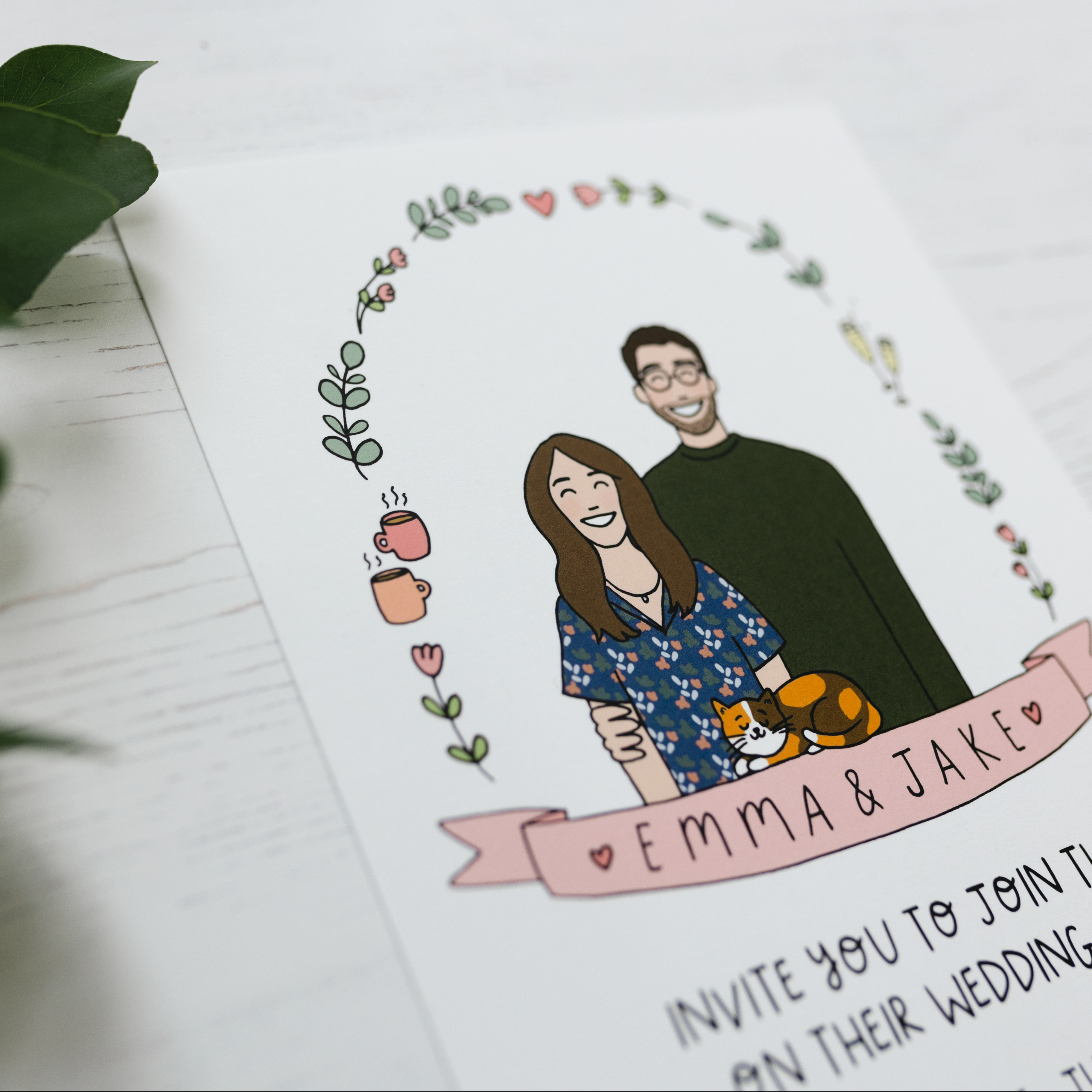 Featuring an customised portrait of the couple, these invitations tell your story and let your personality shine through. Your loved ones will smile when they learn all the information about your big day. You can be wearing exactly what you like in the illustration, and also can feature cute personalised items around the border.