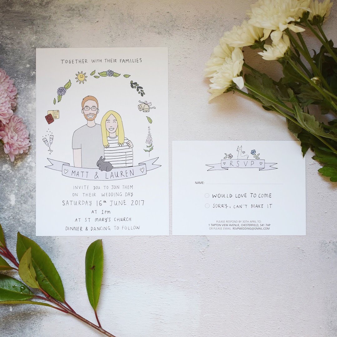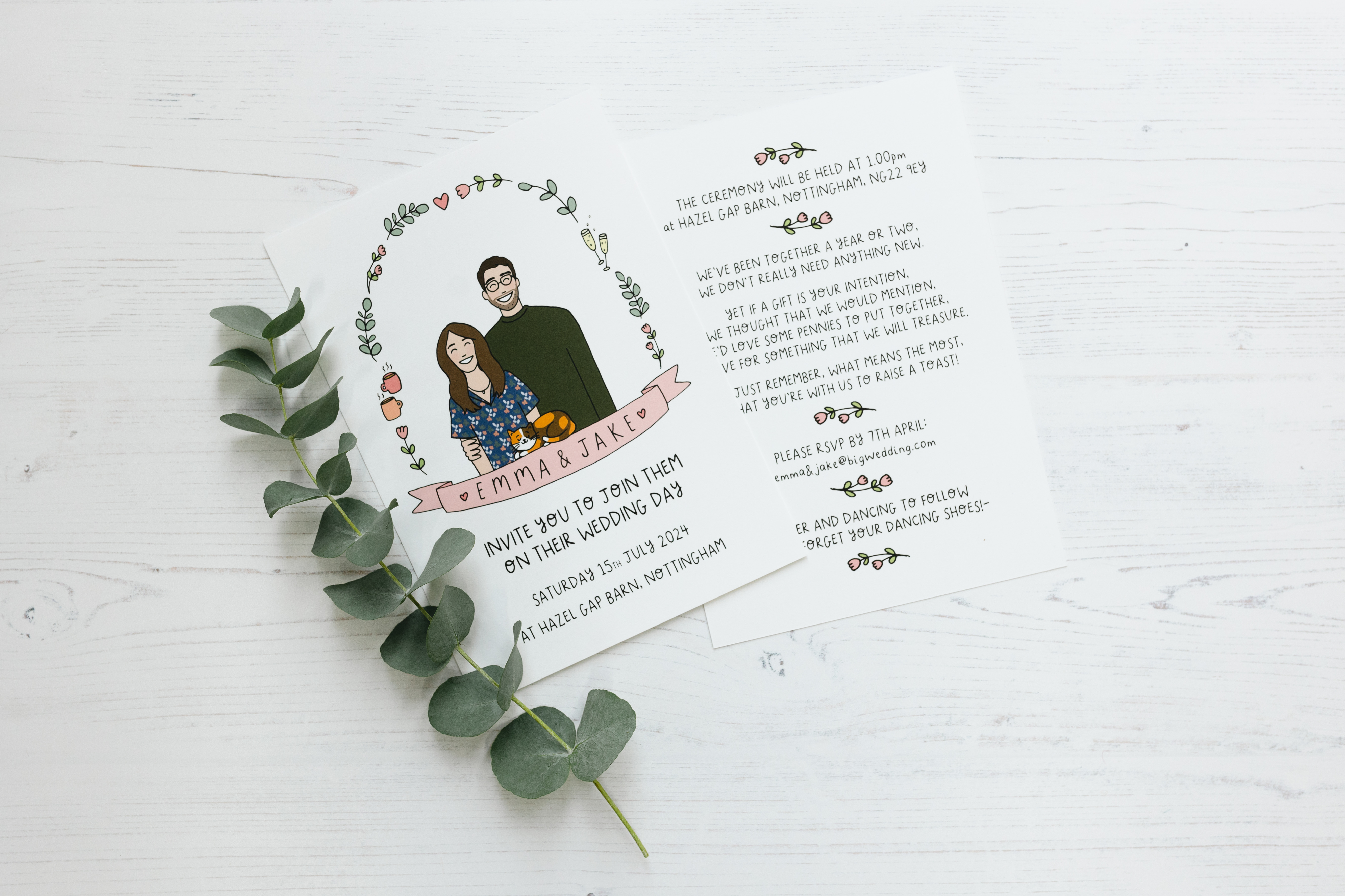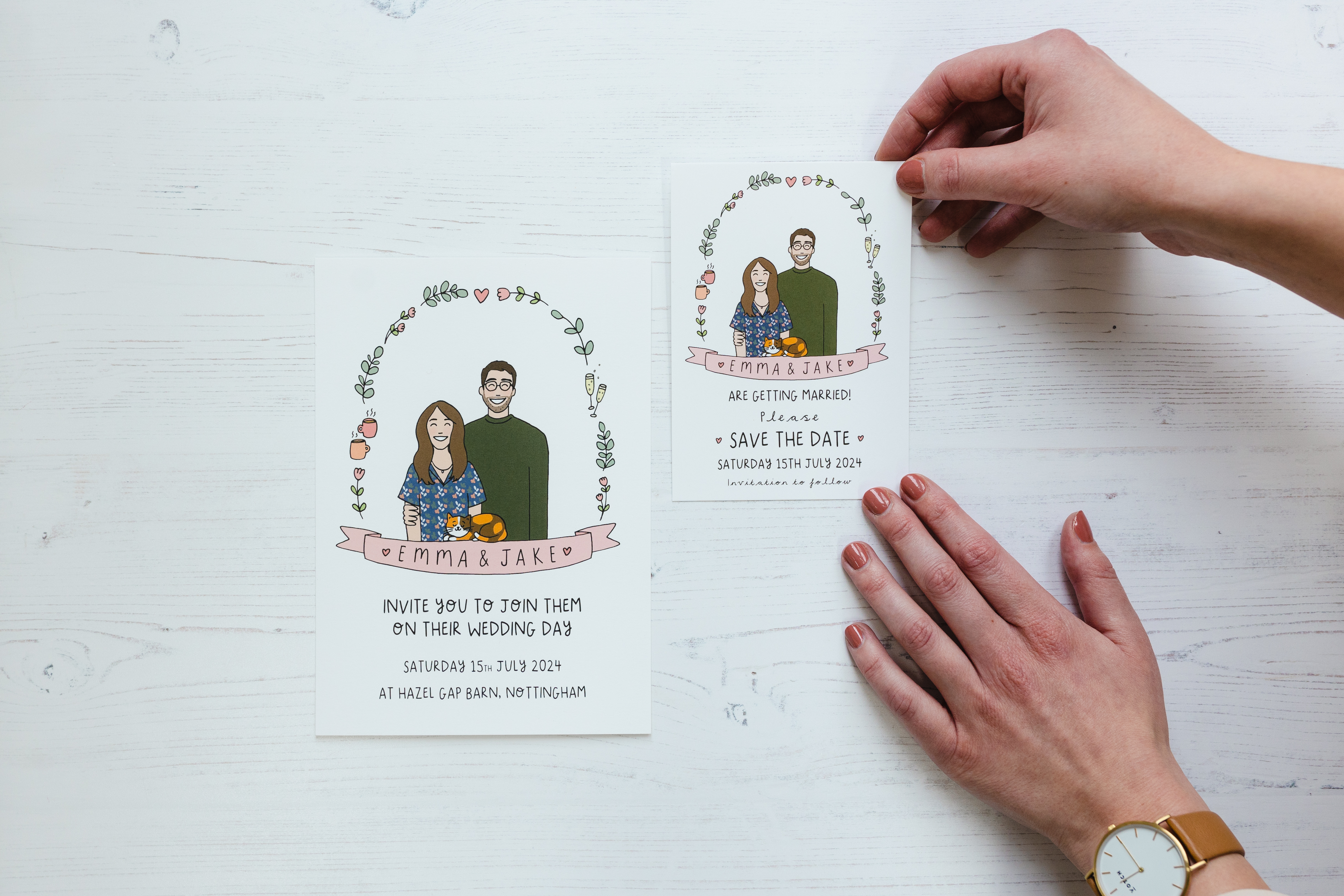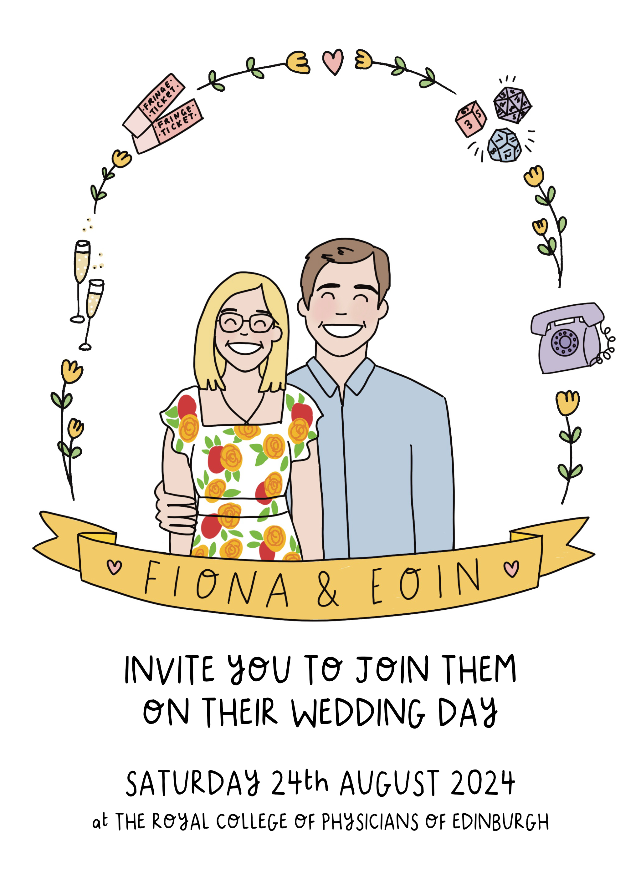 Featuring an customised portrait of the couple, these invitations tell your story and let your personality shine through. Your loved ones will smile when they learn all the information about your big day. You can be wearing exactly what you like in the illustration, and also can feature cute personalised items around the border.