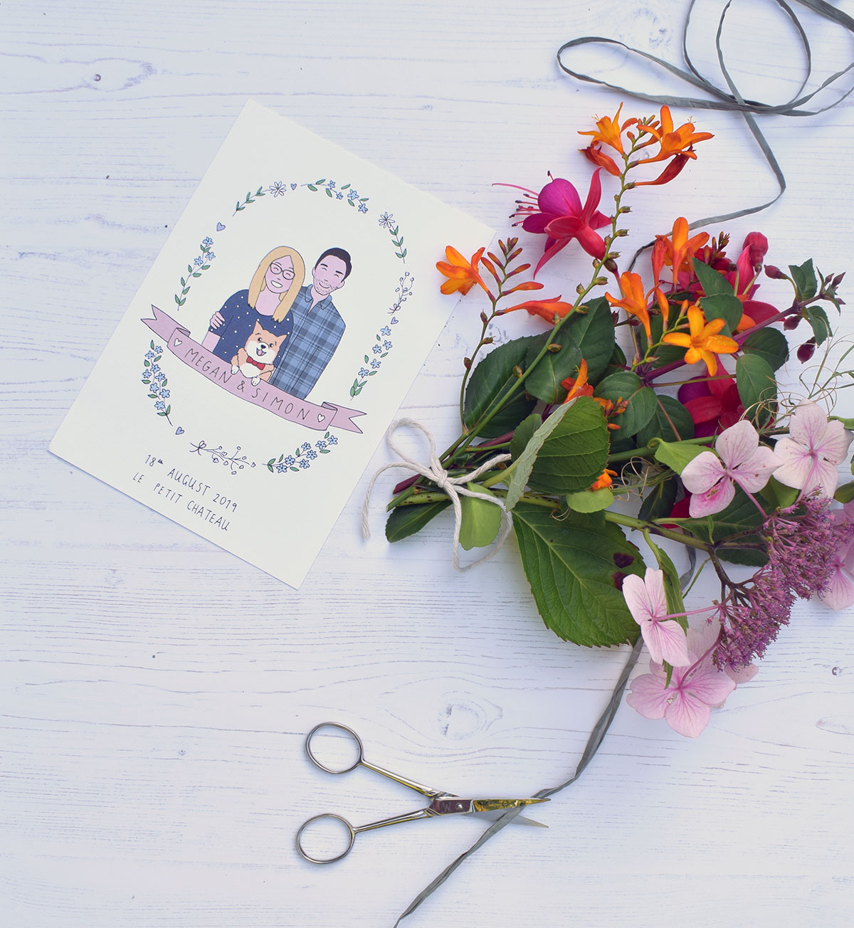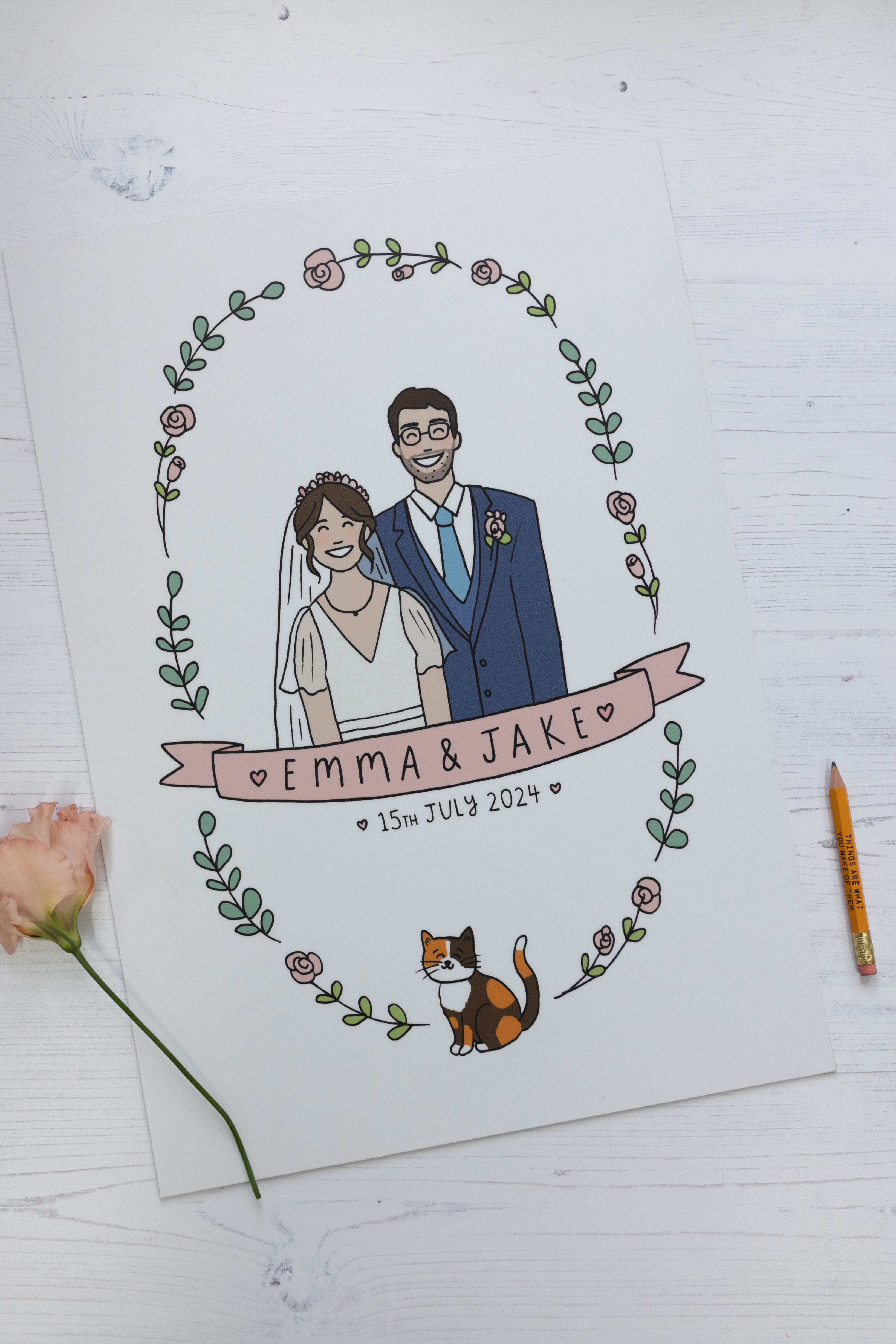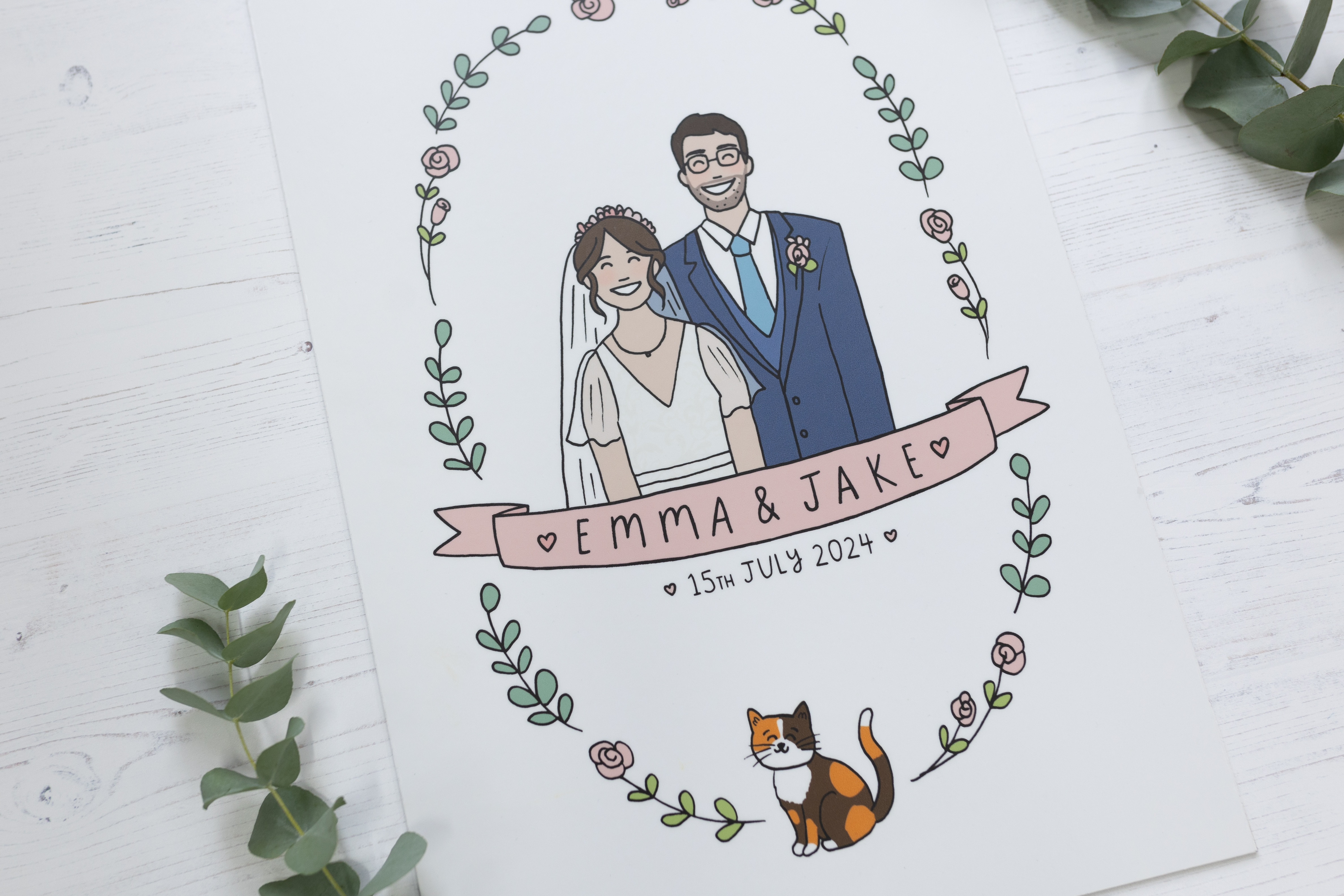 ā Completely personalised card featuring a custom drawing of the lovely couple. I am always very happy to include pets!