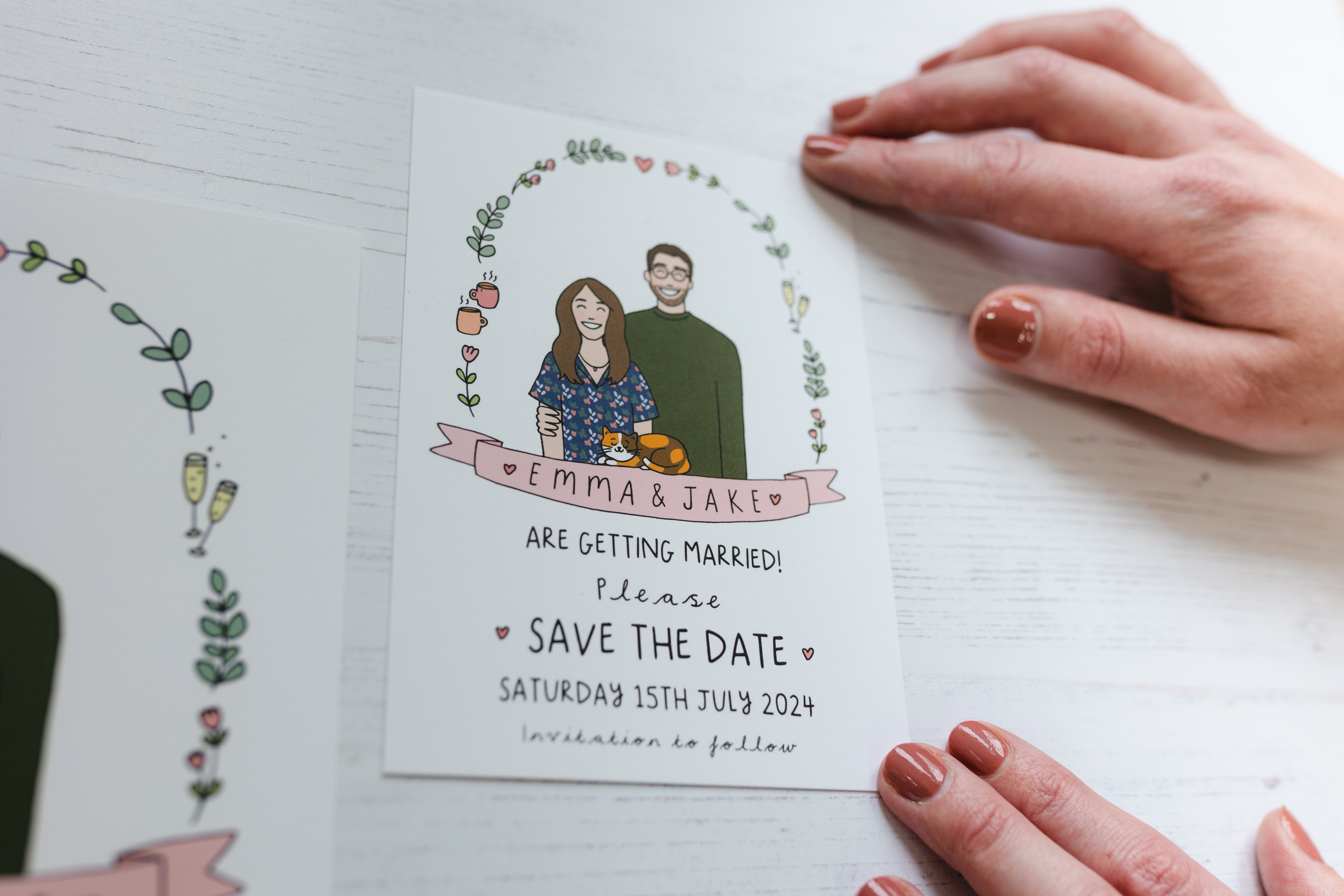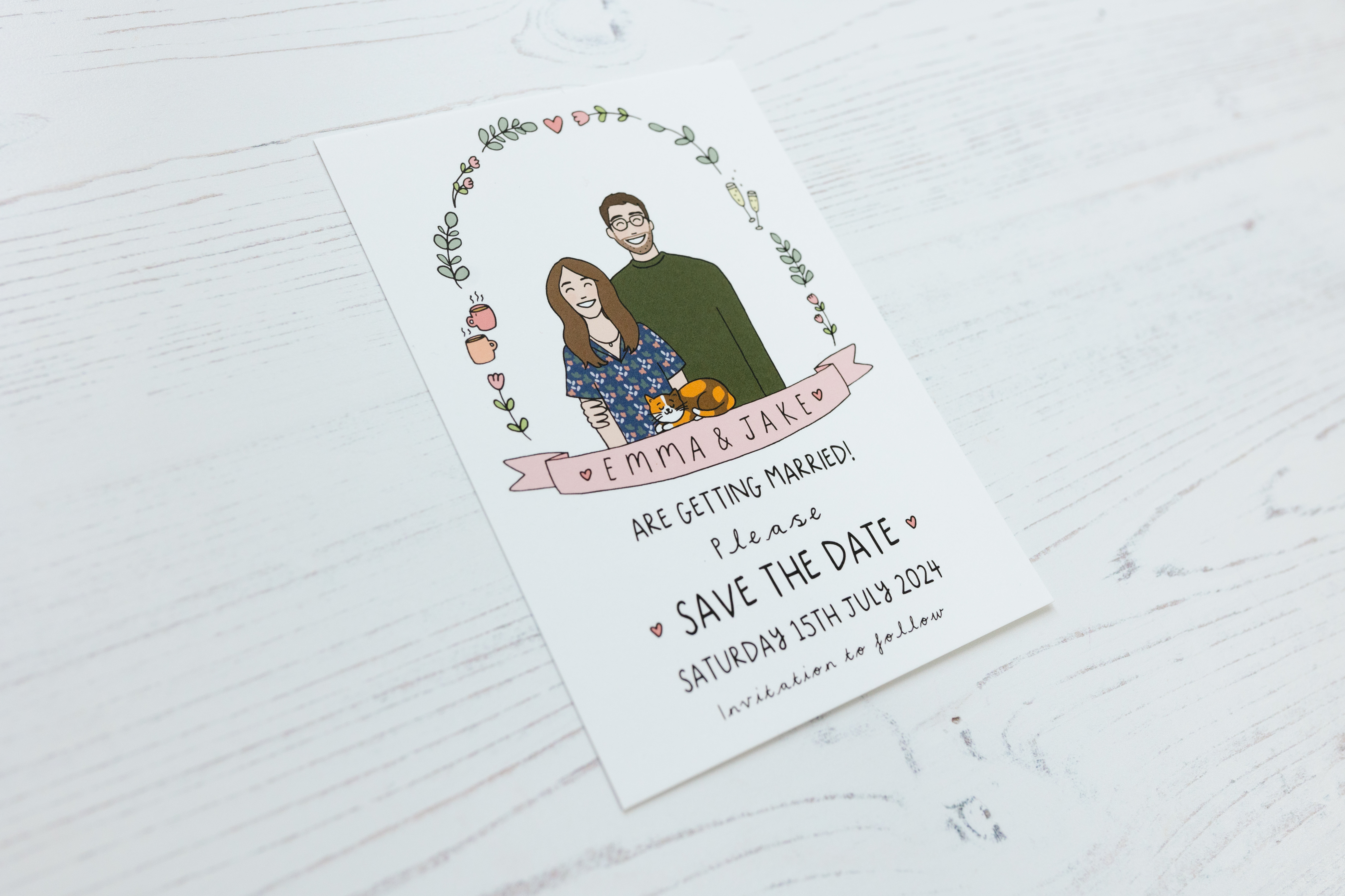ā Completely personalised Save the Date featuring a custom drawing that includes the couples favourite things