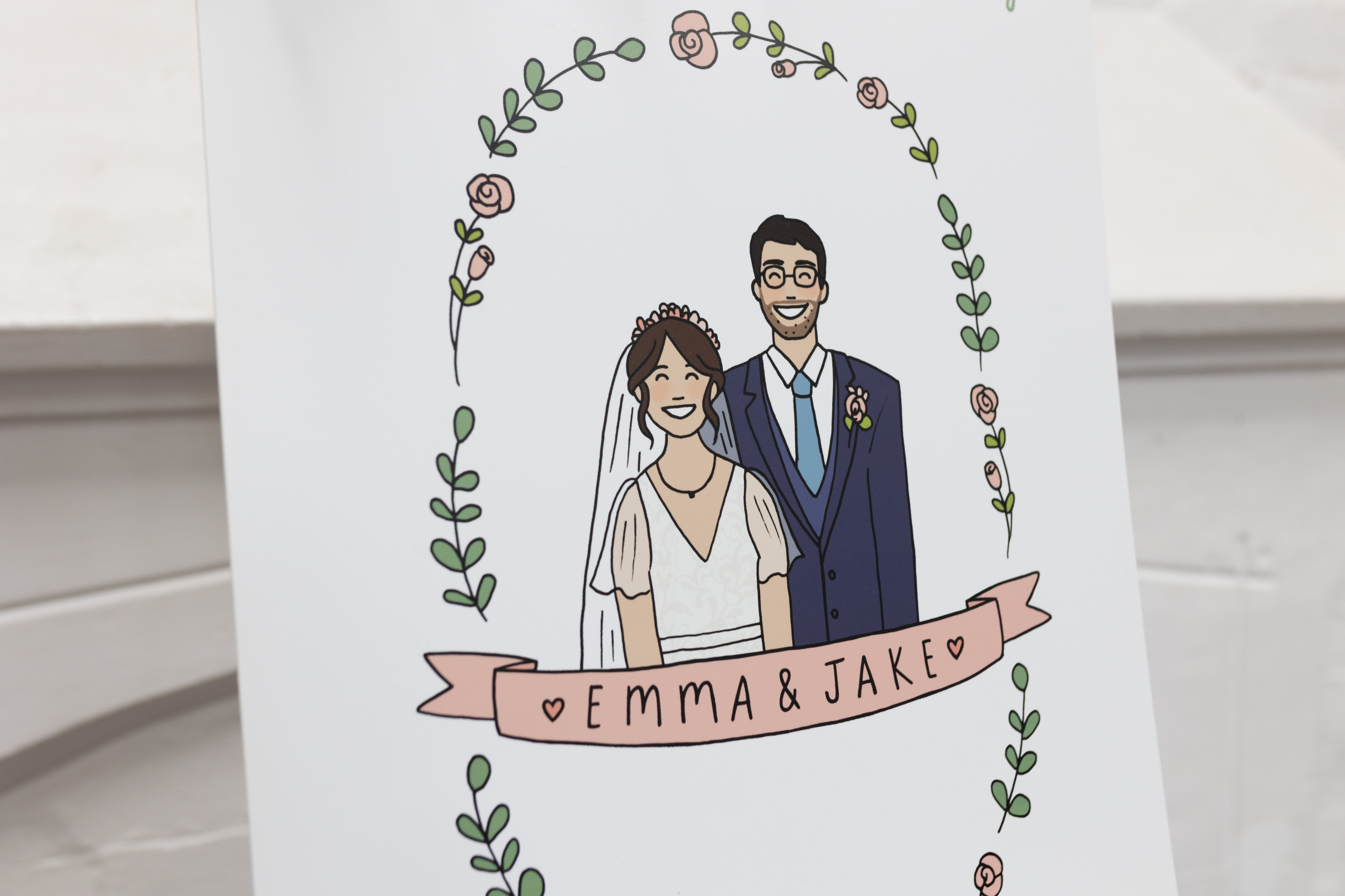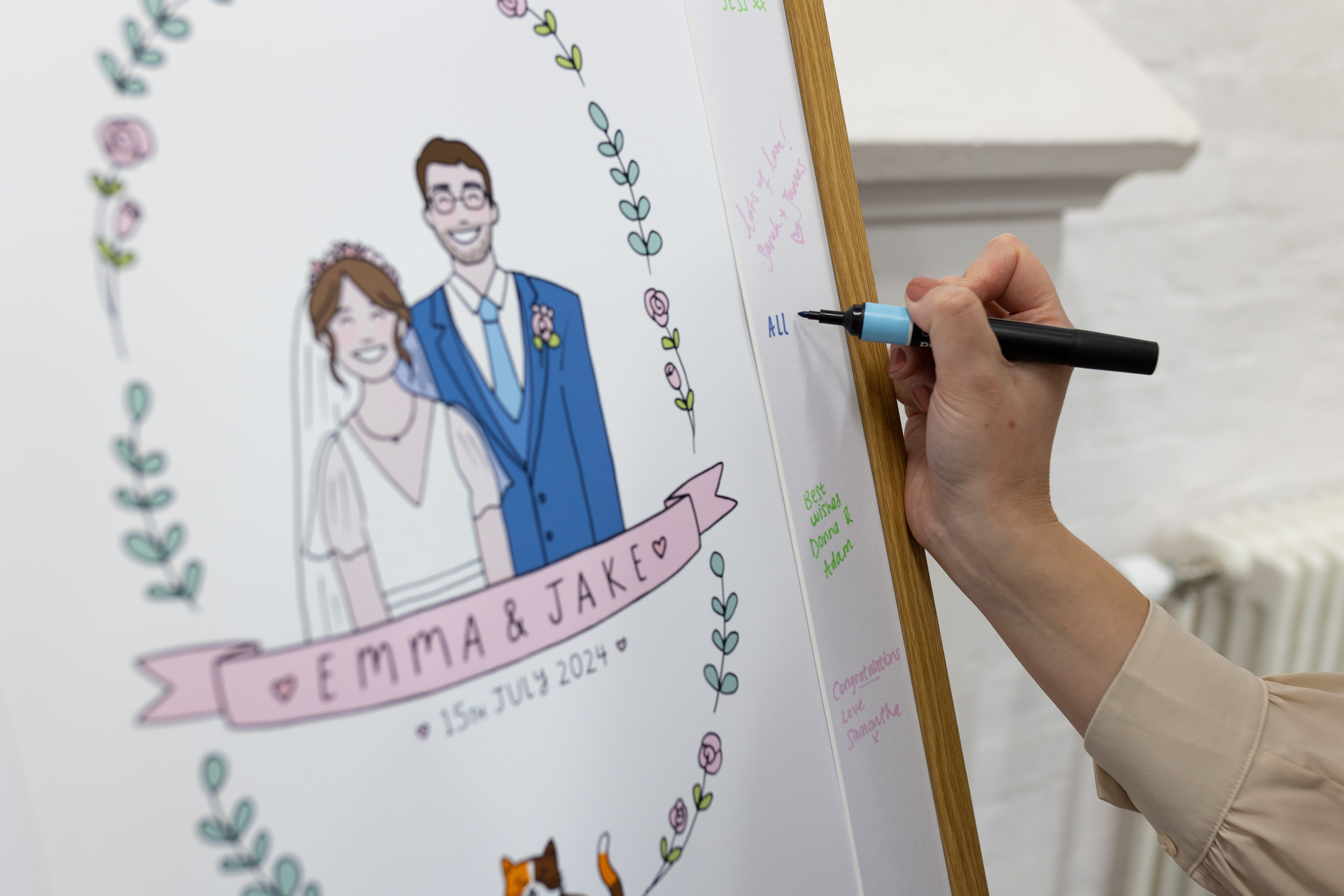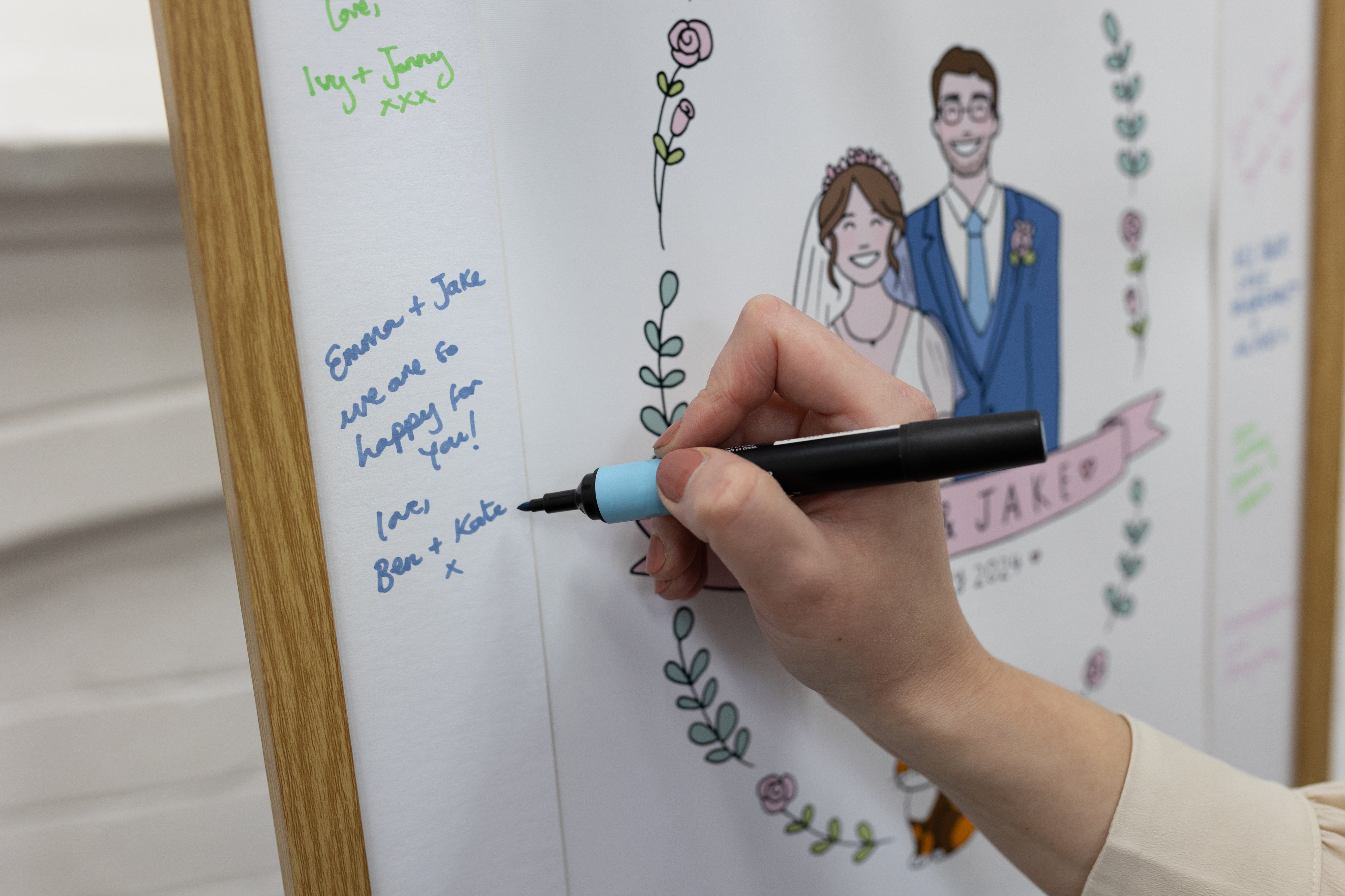 Your guests will love the illustrated versions of you smiling at them as they sign a little message around the portrait.