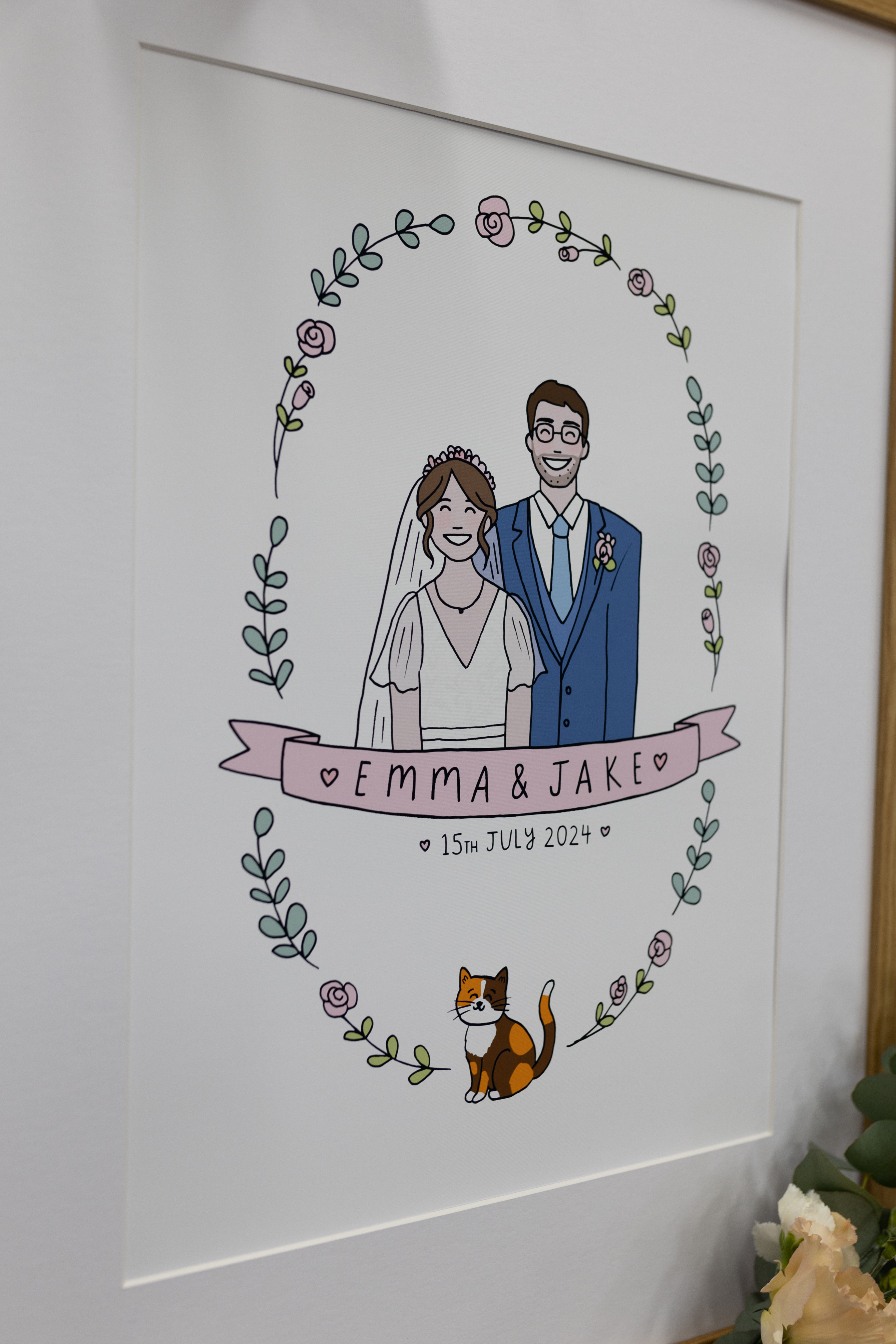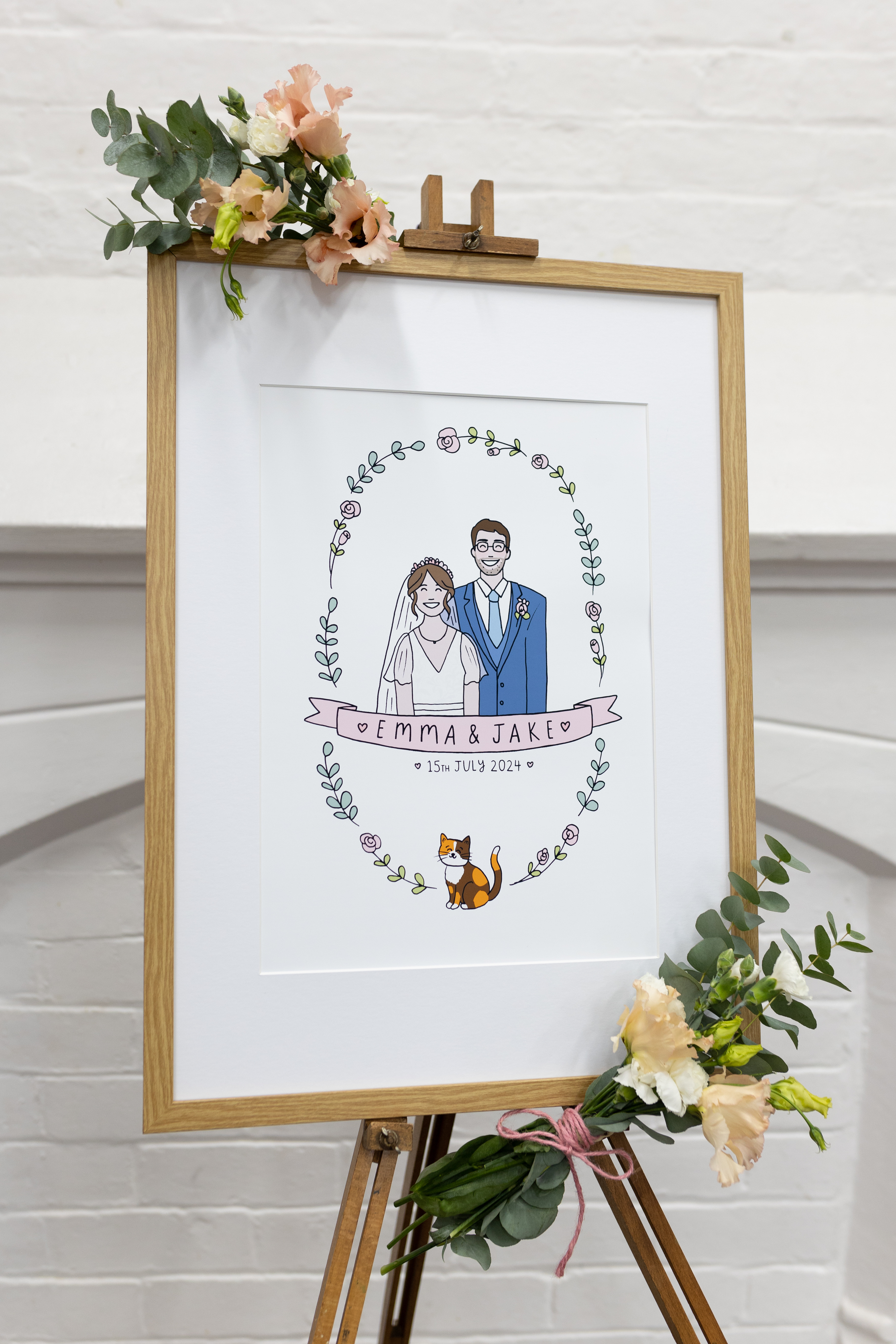 ā A beautiful personalised illustration of the couple with space around it for guests to leave their signature or a message